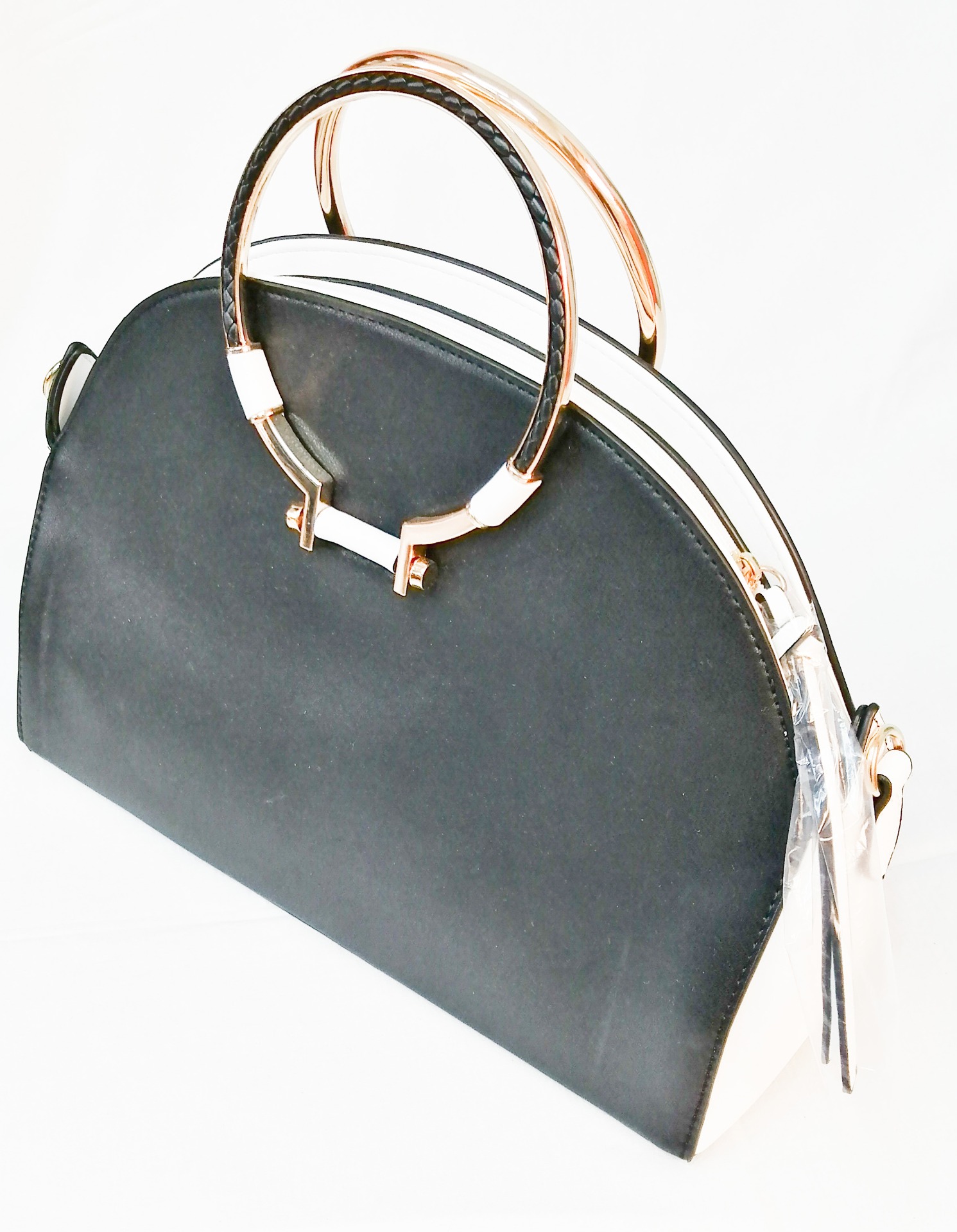 borsa rigida nera con laterali bianchi manico dorato possibilità tracolla  chiusura a zip